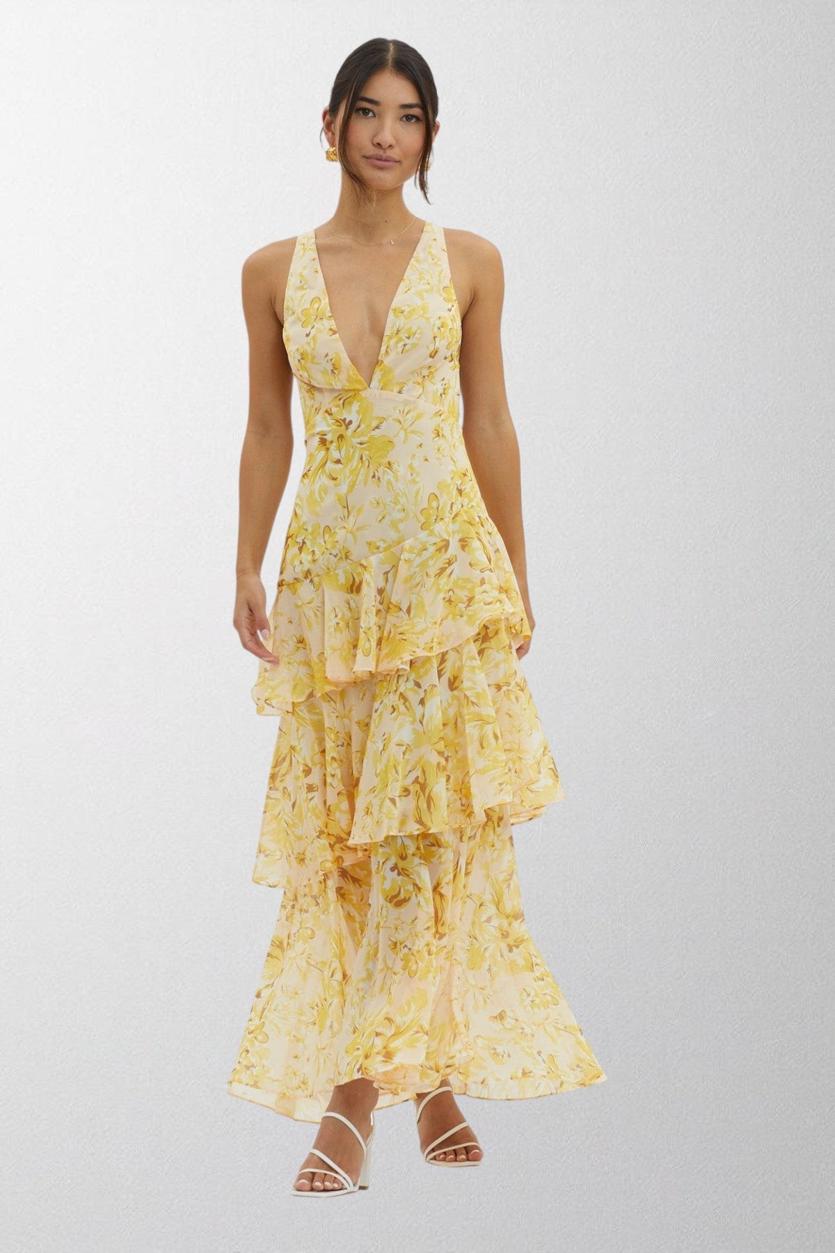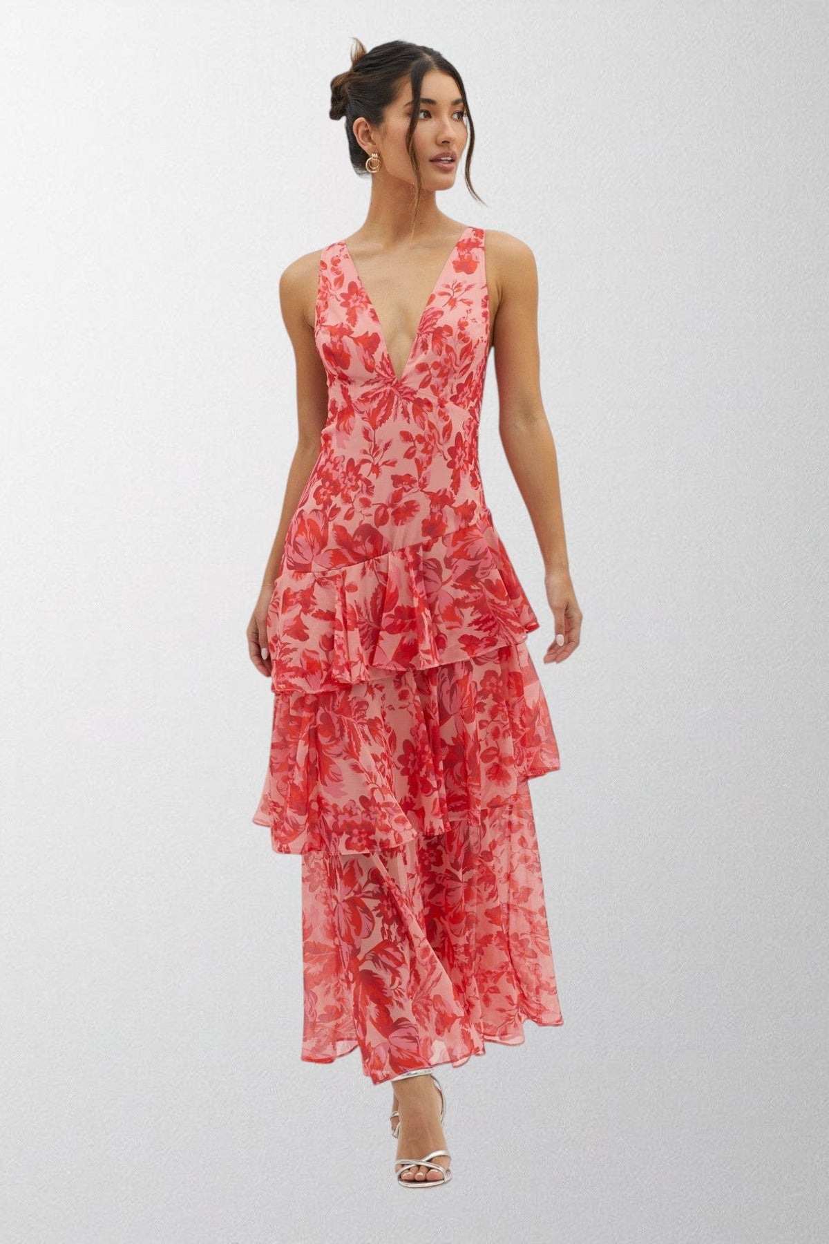 Designet til at fange skønheden i blomstrende blomster, har denne midi kjole en dyp V-udskæring og lagdelt flæse nederdel, der bevæger sig med hvert skridt. Et perfekt valg til havefester, sommerbryllupper eller stilfulde aftener, der kombinerer friskhed med tidløs elegance.