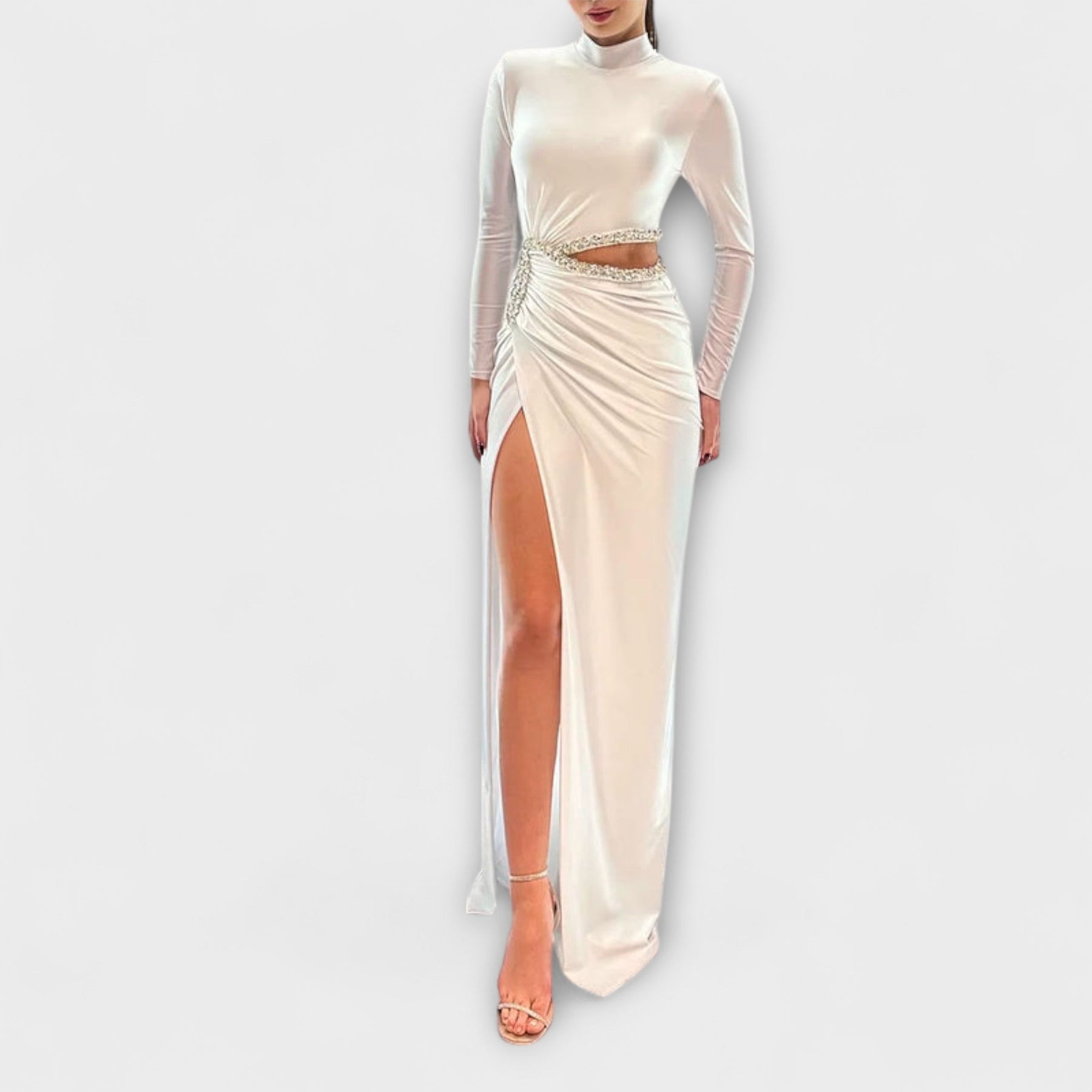 Alina - Lang hvid kjole med lange ærmer, udskæring og strassdetaljer