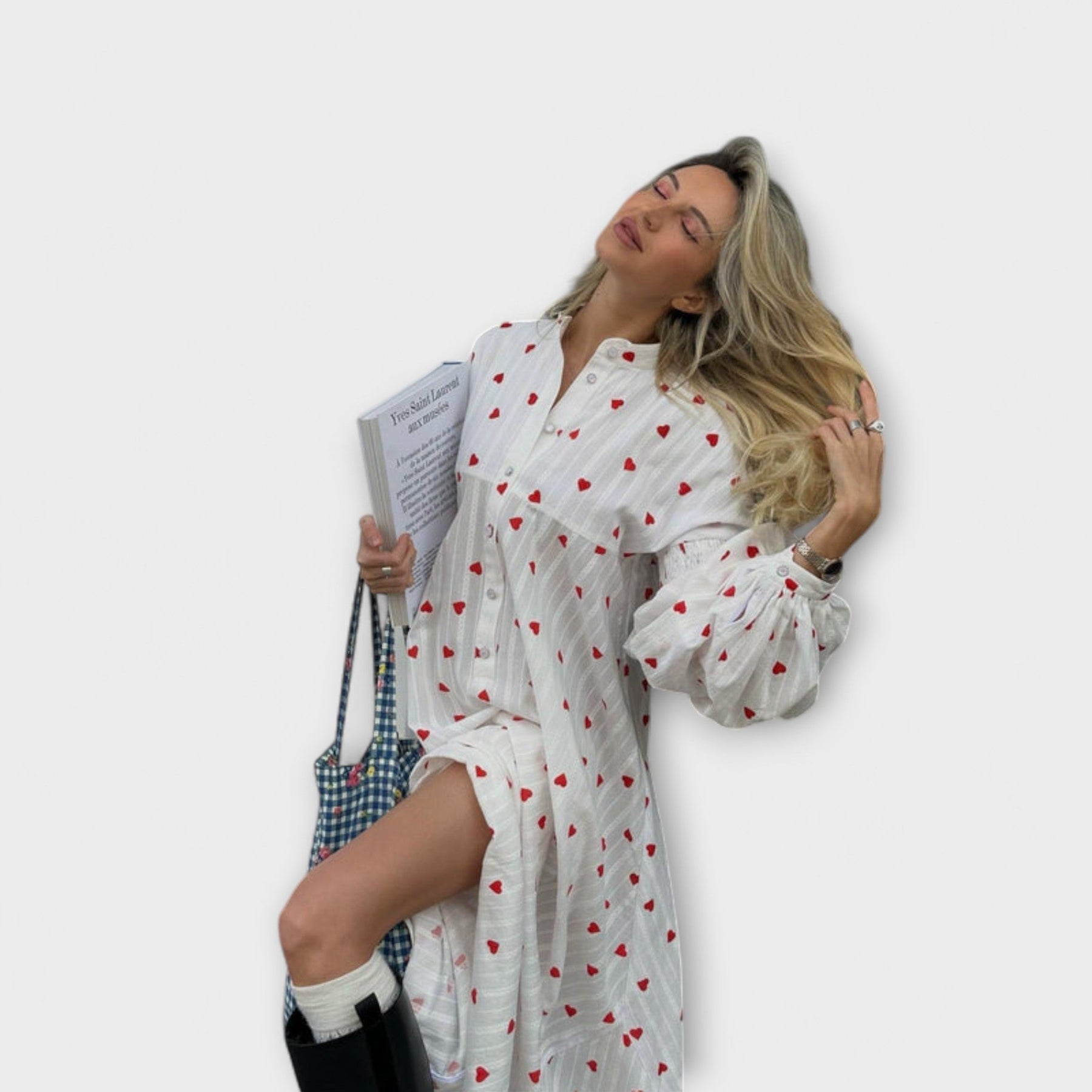 Ophelia Kjolen – Oplev essensen af afslappede dage i en europæisk landsby med denne fantastiske kjole. Fremstillet i 100 % premium jacquard polyester, prydes den med et iøjnefaldende lys rødt hjerte – en klar erklæring om stil.