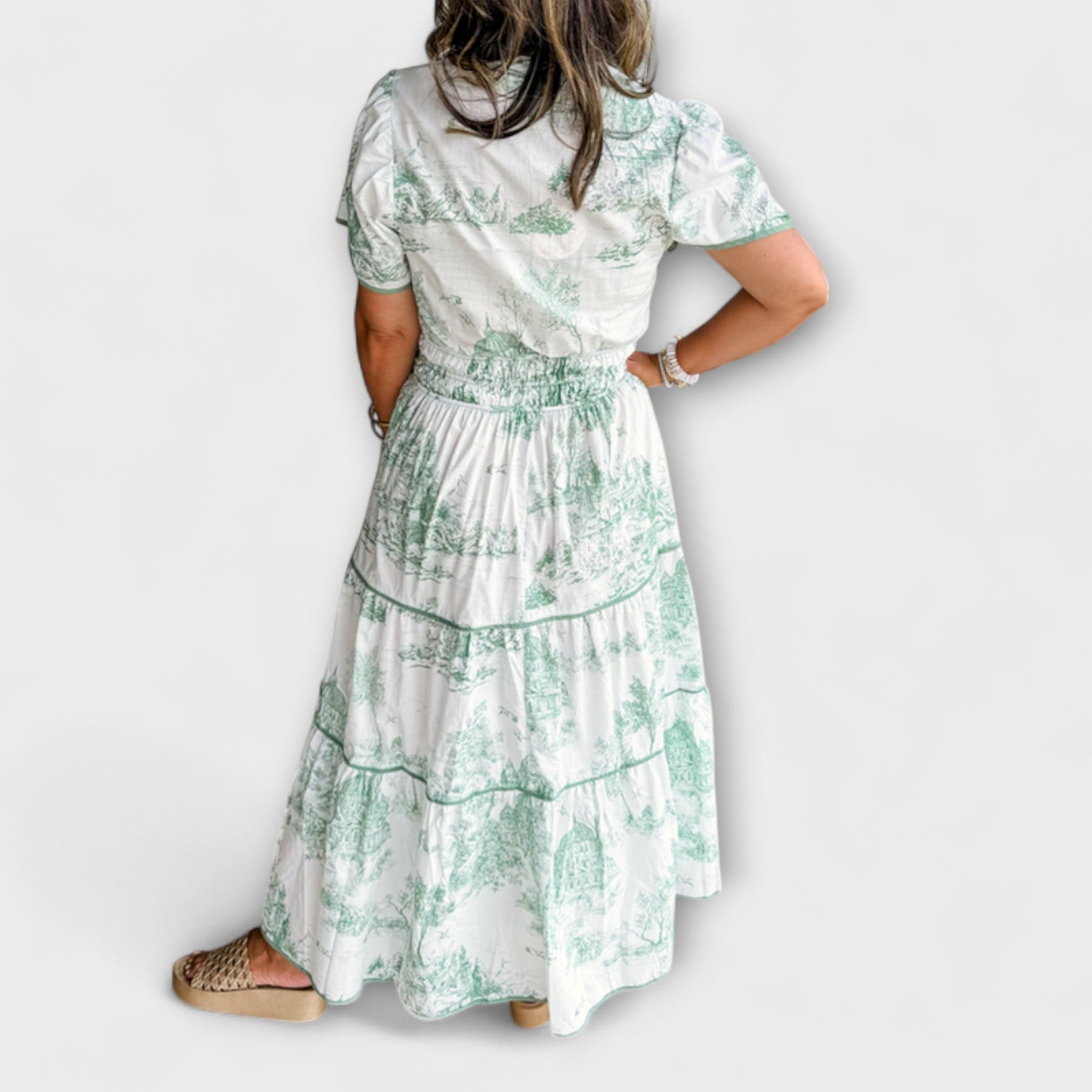 Oplev tidløs elegance og stor komfort med maxi kjolen Sofia. Det smukke grønne og hvide stofprint udstråler klassisk romantik og er et must-have i din forårsgarderobe.
