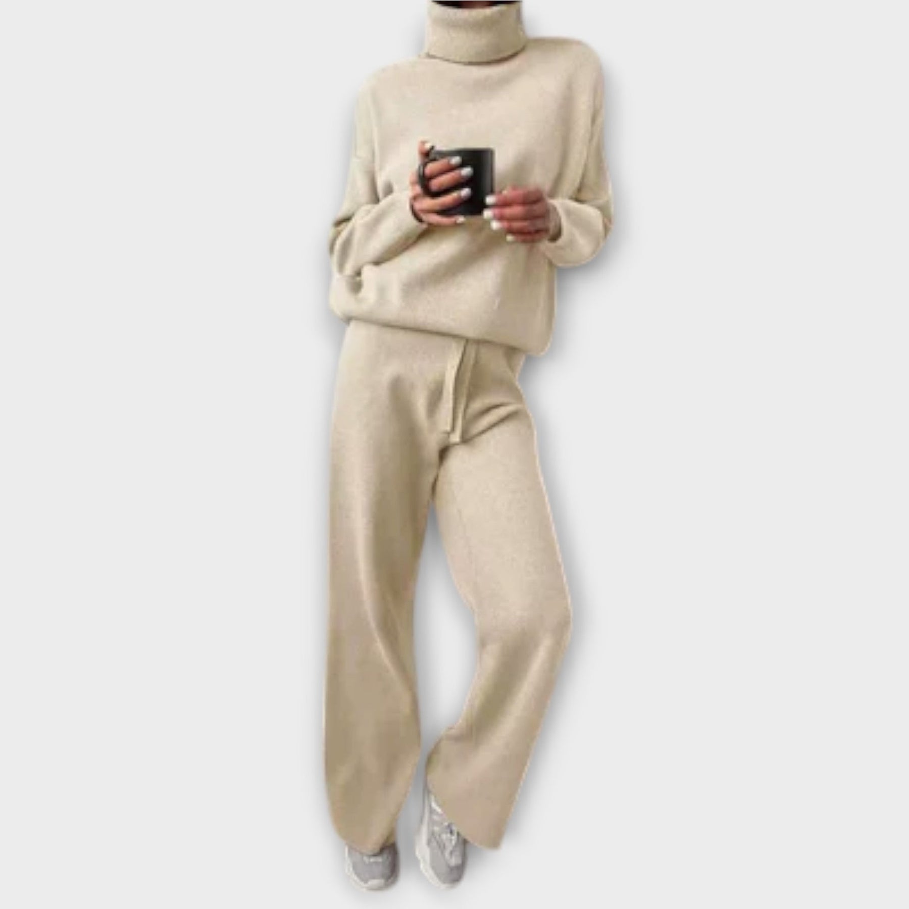 Svøm i varme og blødhed med Theresa sættet – et afslappet strikensemble, perfekt til kolde morgener eller langsomme aftener derhjemme. Sættet inkluderer en løs turtleneck jumper og brede bukser med en komfortabel snor i taljen, der tilbyder ubesværet stil med maksimal hygge.
